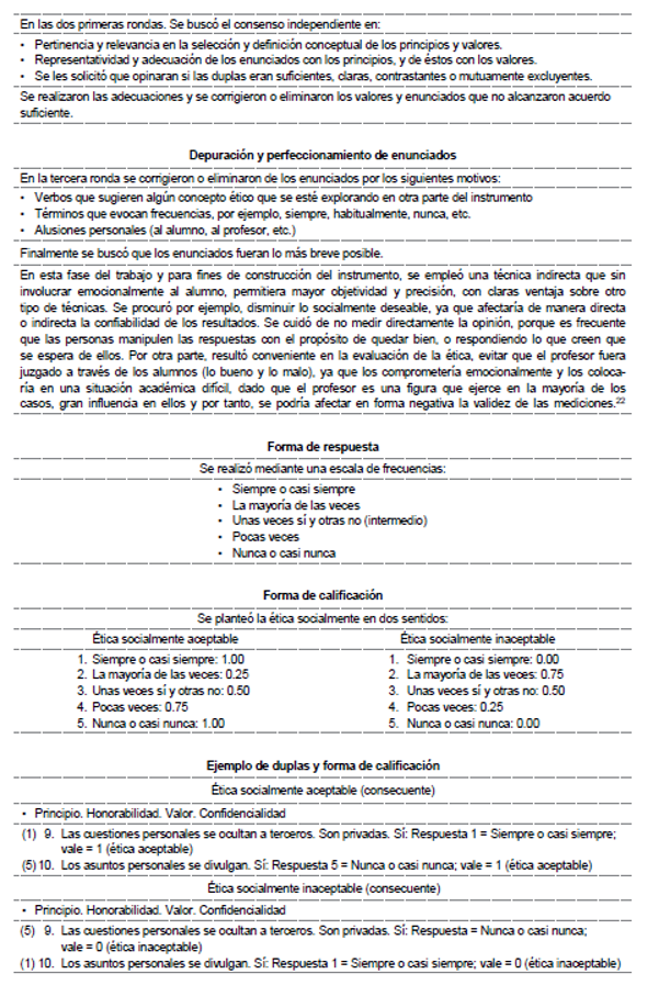 El instrumento se sometió a tres rondas de expertos a fin de buscar consenso independiente acerca de la pertinencia de la selección y definición conceptual de los principios y valores; también se solicitó que opinaran si los enunciados se desprenden apropiadamente de los valores y si razonablemente son situaciones que suceden con alguna frecuencia, lo que ayudó a dar al instrumento adecuación empírica. Asimismo, se les solicitó que indicaran si los enunciados de las duplas eran diametralmente opuestas, contrastantes o mutuamente excluyentes, a fin de corregir o eliminar los enunciados en los puntos en que estaban en desacuerdo.23