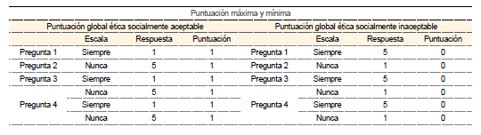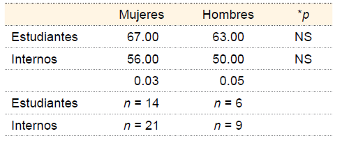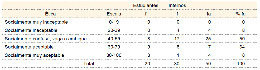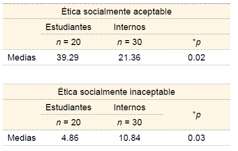 En la percepción socialmente aceptable y lo inaceptable se encontraron diferencias estadísticamente significativas entre estudiantes e internos. En el caso de lo socialmente aceptable, los estudiantes tuvieron una puntuación mayor que los internos. En la percepción de lo ético socialmente inaceptable la puntuación fue mayor en favor de los internos (cuadro II).