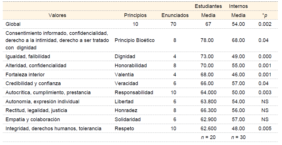 Resultados: en el análisis global, al comparar las medias, los estudiantes dieron mayor puntuación que los médicos internos con una p < 0.002. En la comparación por principios, se encontraron diferencias en 7 de los diez principios explorados y en tres (libertad, honradez y solidaridad) no se encontraron diferencias en el índice de percepción de lo ético (IPE). Hubo diferencias estadísticas significativas entre ambos grupos con una p < 0.04 en donde los estudiantes la perciben con mejores puntuaciones que los internos.