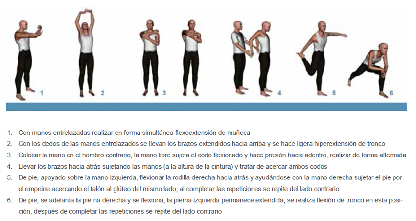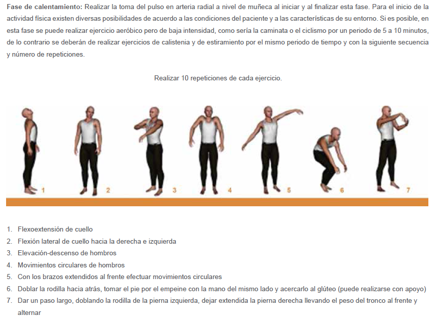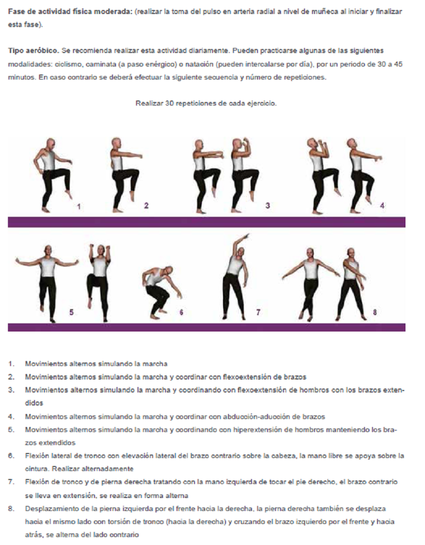 Efectuar un plan de ejercicios (con las tres fases: calentamiento, aeróbico/ resistencia y relajación), que incluya caminata (30 a 45 min) o natación.