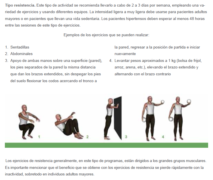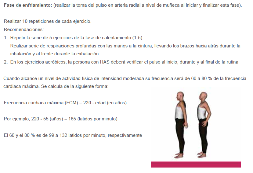 Es importante, enfatizarle al paciente que el ejercicio físico28-31 se realice de 5 a 7 días a la semana (R-I),10 dado que se ha demostrado que reduce la PAD y PAS.18,21,23 De ahí, la necesidad de proporcionarle un plan de ejercicios supervisado (anexo I). Para personas adultas mayores, se aconsejará practicar yoga 3 veces por semana32 o Taichí