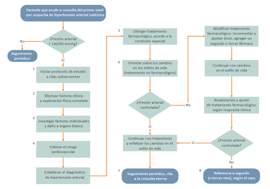 Introducción: la hipertensión arterial (HA) ocupa el primer lugar de atención en unidades médicas de primer nivel. La mitad de los pacientes con HA no están controlados. El objetivo de este documento es proporcionar las recomendaciones de la guía de diagnóstico y tratamiento de HA en el primer nivel de atención que han sido consideradas clave para el proceso de atención, con el fin de ayudar a los profesionales de la salud, en la toma de decisiones clínicas.