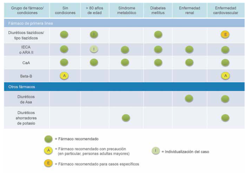 El tratamiento de inicio en pacientes con hipertensión arterial se establece con los siguientes fármacos conocidos como de primera línea (R-I),10 (R-A, B):11