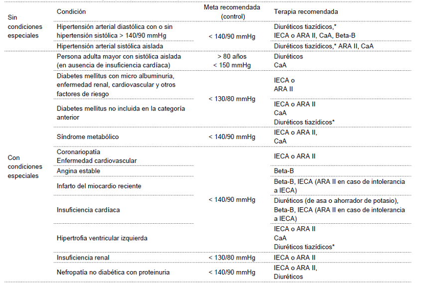 El objetivo del tratamiento es controlar y mantener la presión arterial en la meta recomendada, así como reducir el riesgo por eventos vasculares y la muerte de la población con hipertensión arterial.17