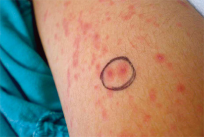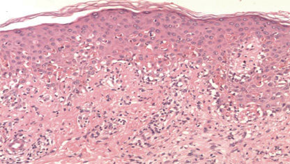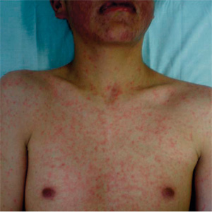 Paciente masculino de 13 años de edad sin antecedentes de importancia. Ingresó al servicio de urgencias de nuestro hospital por fiebre, astenia, hipodinamia, hiporexia, hiperemia conjuntival, úlceras en mucosa oral, disfagia, así como exantema máculo-papular pruriginoso en cara, cuello, tórax y extremidades superiores de cuatro días de evolución. Tres semanas previas al cuadro se le prescribió alopurinol debido a hiperuricemia asintomática (ácido úrico sérico de 7.3 mg/dl). Ningún otro medicamento o infección reciente se documentó. A la exploración física se observaron úlceras en mucosa oral y genital, hiperemia conjuntival y dermatosis diseminada a cara, cuello, tórax, abdomen y extremidades superiores, caracterizada por pápulas eritematosas dispuestas en diana con algunas vesículas (figuras 1 y 2). La superficie corporal afectada fue cercana al 40%. A su ingreso se suspendió el alopurinol, se realizó biopsia de piel afectada y se solicitaron estudios paraclínicos en los que destacaron PFH anormales con patrón hepatocelular (DHL 706 UI/l, TGO 175 UI/l, TGP 475UI/l, FA 235.6 UI/l). La biometría hemática, los reactantes de fase aguda, los electrolitos séricos, la química sanguínea y el examen general de orina fueron normales. El diagnóstico histopatológico fue necrólisis epidérmica tóxica (figura 3). El tratamiento fue con metilprednisolona las primeras 72 h (1.5 mg/kg/día) con posterior esquema de reducción. Recibió tratamiento multidisciplinario por parte de los servicios de nefrología, endocrinología, oftalmología y dermatología. Fue egresado por mejoría clínica.
