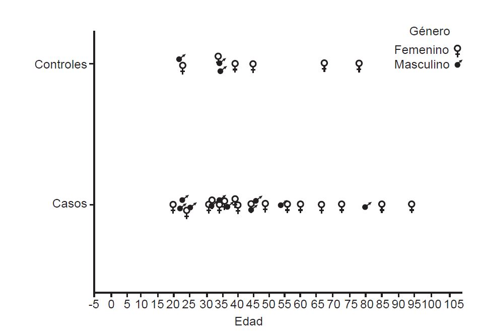 En el grupo de los casos se encontraron 18 mujeres, lo cual correspondió al 64.28 %. La media del IMC fue de 27.24, con rangos de 19.22 a 36.68. En el grupo de controles se encontraron seis mujeres, que representaron el 66.66 %, con una p = 0.896 (figura 1) y la media del IMC fue de 25.22 con rangos de 18.5 a 29.9, con una p = 0.251.