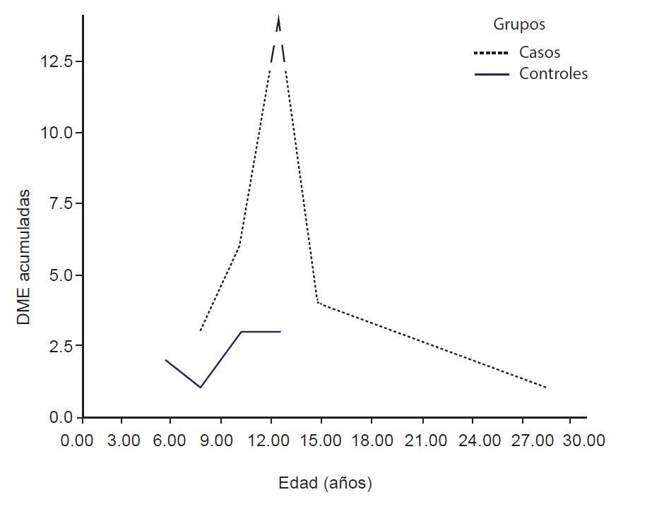 En el grupo de controles, el estreñimiento se encontró en cuatro pacientes (p = 0.008) con una RM de 0.096 (IC 95 %: 0.014-0.675) y la diarrea en cinco pacientes con una p = 0.001, RM = 0.062 (IC 95 %: 0.009-0.432). Tres pacientes presentaron fiebre con p = 0.327, RM = 0.432 (IC 95 %: 0.08-2.356).