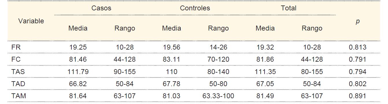 En el grupo de controles se registró una media para la frecuencia respiratoria de 19.56 (p = 0.813) y para la frecuencia cardiaca de 83.11 (p = 0.791). La media de presión arterial sistólica fue de 110 (p = 0.794) y 67.78 para la presión arterial diastólica (p = 0.802) (cuadro I).