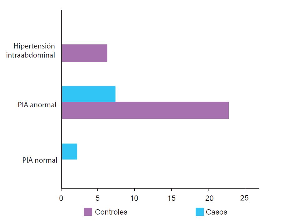 En relación con la presión intraabdominal, en el grupo de casos se encontró una media de 11.33 mmHg con rangos de 5.97 a 29.1. Al analizar tomando como presión normal < 5 mmHg y alta > 5.1 mmHg encontramos que el 100 % de los casos se encontró en el rango de alta.