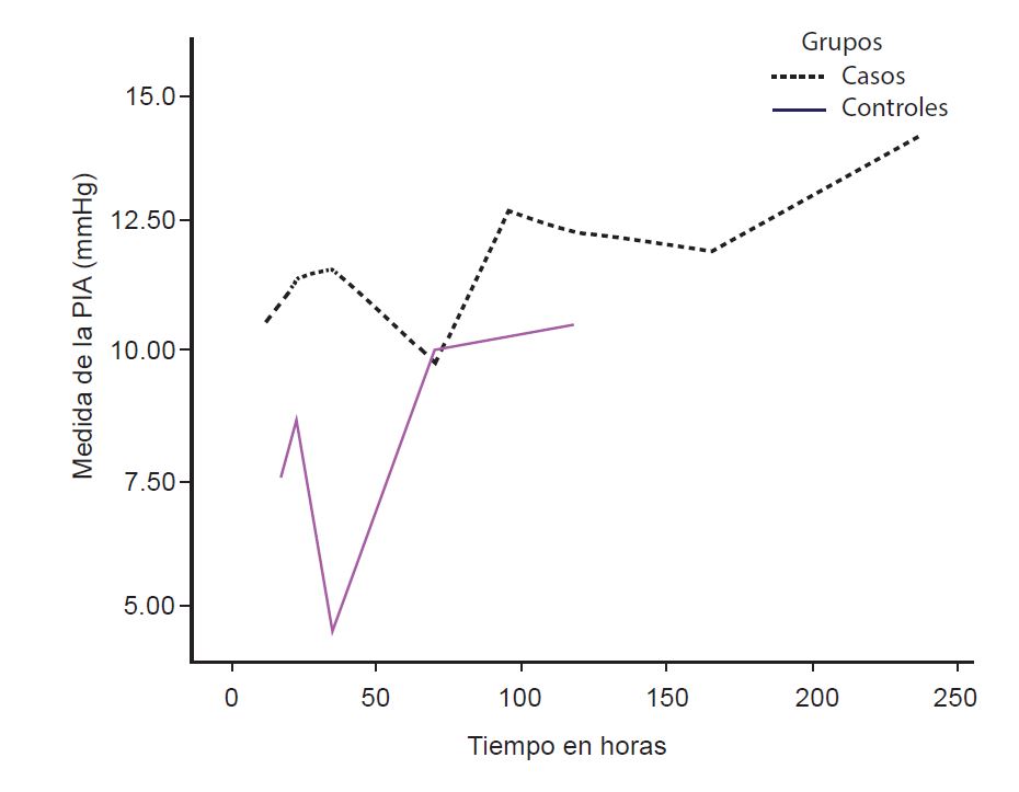 No se encontraron diferencias significativas en el tiempo de evolución entre los grupos, lo que asegura que esta variable no influyó en los resultados del estudio. En ambos grupos el mayor aumento de la presión intraabdominal fue entre las 70 y las 100 horas, lo que coincide con otro estudio que reportó que al tercer día de enfermedad los pacientes presentaron hipertensión intraabdominal. A diferencia de ese mismo estudio sí encontramos diferencia significativa en el tiempo de evolución entre los pacientes con hipertensión intraabdominal y los pacientes con PIA (< 11.9), por lo que consideramos que la PIA sí se relaciona con el tiempo de evolución del padecimiento.25 Todos los pacientes que se registraron en el grupo de casos presentaron una PIA > 10.5 mmHg a las 24 horas, mientras que los controles que se midieron en las primeras 24 horas presentaron una PIA < 8.5.