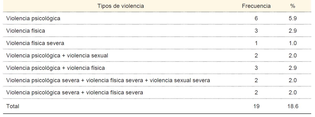 Del total de participantes a las que se les aplicó el cuestionario Índice de Severidad de Violencia de Pareja, el 18.6 % (n = 19) padeció violencia. De este porcentaje, 5.9 % presentó violencia psicológica (n = 6), 10.8 % padeció violencia física (n = 11) y la violencia sexual se presentó en el 4 % (n = 4) (cuadro I).