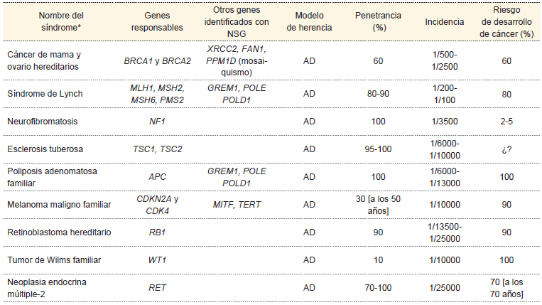 Otros síndromes en los cuales una o dos mutaciones de genes se heredan de modo autosómico dominante y que predisponen al desarrollo de cáncer son el síndrome linfoproliferativo autoinmune, el de Birt-Hogg-Dubé, el de Carney, el de cordoma familiar, el de nevos displásicos con melanoma familiar (P-O), el de cáncer gástrico difuso hereditario, el de cáncer esofágico con tilosis, el síndrome de Li-Fraumeni, la neoplasia endocrina múltiple 1/2, la osteocondromatosis múltiple, las neurofibromatosis 1 y 2 (P/O), el síndrome de carcinoma nevoide basocelular, el cáncer prostático familiar, la leiomiomatosis hereditaria y el cáncer renal, el cáncer renal papilar hereditario (P/O), el síndrome de paraganglioma/feocromocitoma hereditario, el retinoblastoma, la esclerosis tuberosa, el síndrome de von Hippel Lindau y el tumor de Wilms (cuadro I).