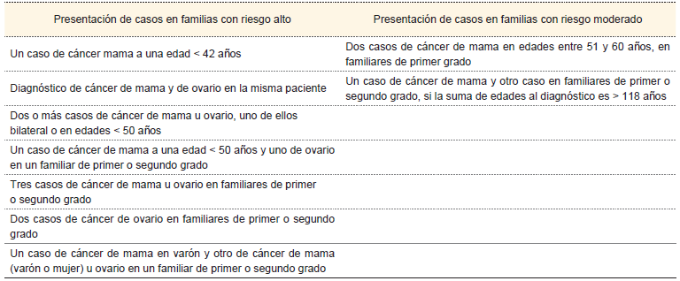 Los criterios clínicos para reconocer a las familias con riesgo alto/moderado de cáncer de mama y ovario se describen en el cuadro II.17,18 La presentación de una de estas características clínicas es suficiente para sospechar que existe un riesgo aumentado de cáncer de mama y ovario familiar, y así derivar al paciente o la familia a la consulta de oncogenética molecular.