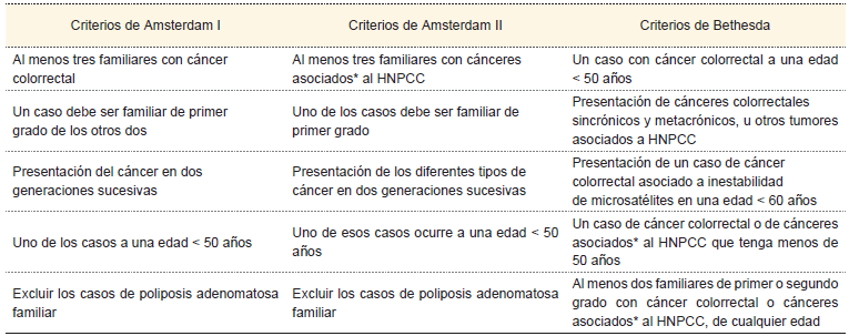 Las guías clínicas para determinar las condiciones de riesgo elevado para desarrollar cáncer colorrectal familiar en el HNPCC se han establecido con base en las cuatro reuniones de expertos en Amsterdam (2) y en Bethesda (2);24,25 de ahí el nombre de las guías. Los elementos clínicos de las cuatro guías son complementarios para sospechar el diagnóstico de cáncer colorrectal familiar. La presentación de una de estas condiciones es suficiente para sospechar de la existencia de cáncer colorrectal familiar y derivar al paciente o a la familia a la consulta oncogenética molecular (cuadro III).
