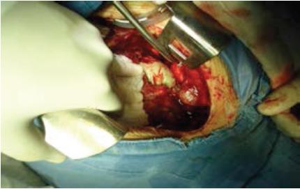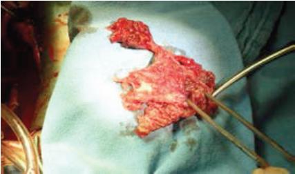Al momento del abordaje intraatrial se identificó lesión tumoral a nivel de la pared anterior de orejuela derecha; se hizo resección del tejido involucrado y se llegó a extirpar hasta el 70 % de la orejuela mencionada, la cual se sustituyó con colocación de parche de pericardio bovino con súrgete continuo de polipropileno 4-0.