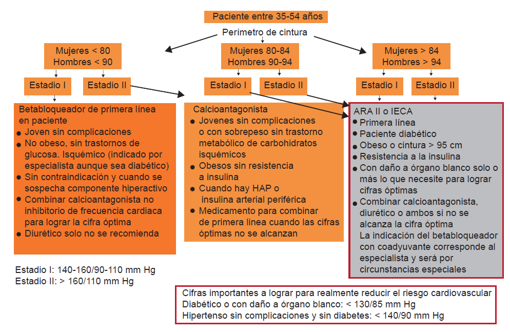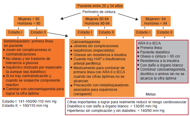 Además, como ya se señaló, la división en dos grandes grupos del sistema de clasificación HTM (tipos 1 y 2) está hecha en relación con la presencia o no del síndrome metabólico o la diabetes. Así, laevidencia actual sugiere que la mayor prevalencia de daño a órgano blanco se da en el grupo de HTM-2. Por lo tanto, no solo es el nivel de presión arterial el único factor que debe determinar la conducta terapéutica farmacológica inicial. Así, por ejemplo, un enfermo entre los 20 y los 34 años sin evidencia de factores de riesgo asociados y sin obesidad puede recibir tratamiento con betabloqueador de primera instancia asociado o no a diurético o bien a un calcioantagonista, dependiendo de la meta que se busca lograr en mm Hg; en cambio, en un individuo de edad similar pero con síndrome metabólico o evidencia de daño renal, el tratamiento de primera línea deberá ser un IECA o un ARA II, con o sin diurético, o bien con o sin calcioantagonista, dependiendo de la meta terapéutica que se busca lograr.