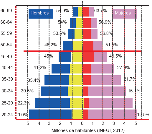 La prevalencia de HTAS guarda estrecha relación con la edad, el medio ambiente, el estilo de vida, el género y los factores comórbidos, como la diabetes, la obesidad, las dislipidemias, el tabaquismo y la predisposición genética.9,11,12 Además, no solo es la gravedad de la HTAS en términos de mm Hg, sino su interacción con estos factores lo que determina la magnitud y la velocidad de progresión de daño a órgano blanco, situación que debe considerarse primordial para la indicación de un tratamiento médico racional. Es por ello que durante la lectura de estas recomendaciones no se deben perder de vista todas las características individuales de la persona con HTAS. 11,12, 13, 14 Es importante reconocer que la mayoría de los lineamientos internacionales (cuyo impacto en la práctica diaria no se ve del todo reflejado)15 están basados en estudios realizados en población anglosajona o caucásica.14, 15, 16 Así, en general, esos estudios incluyen a personas de más de 55 años. Sin embargo, en México la distribución poblacional es aún de tipo piramidal, es decir, la mayor parte de la población adulta se ubica entre los 20 y 54 años. Por lo tanto, si bien es cierto que la prevalencia de la HTAS en términos porcentuales se relaciona de manera directa con la edad, al cuantificar el número absoluto de pacientes portadores de HTAS, se encontró que en México aproximadamente el 75 % de los hipertensos tienen menos de 54 años de edad (figura 3). Por lo tanto, debemos desmitificar que la HTAS es una enfermedad de gente adulta mayor de 60 años.16,17