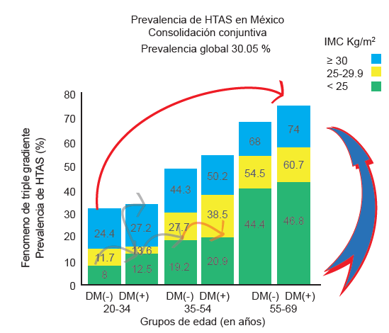La hipertensión arterial es la ECEA de RCV que tiene mayor prevalencia mundial (figura 1).2 En 1993 se reportó en México una prevalencia del 25 %; sin embargo, para el año 2000 la prevalencia informada de HTAS entre los 20 y los 69 años fue del 30.05 %, es decir, más de 15 millones de mexicanos de dicho grupo de edad la padecían.3,4 la Encuesta Nacional de Salud (ENSANUT) 2010 reportó que 31 % de los mexicanos tenía hipertensión arterial, es decir, para 2014 se estimó que aproximadamente 24 millones de adultos mayores de 20 años fueron portadores de HTAS.5