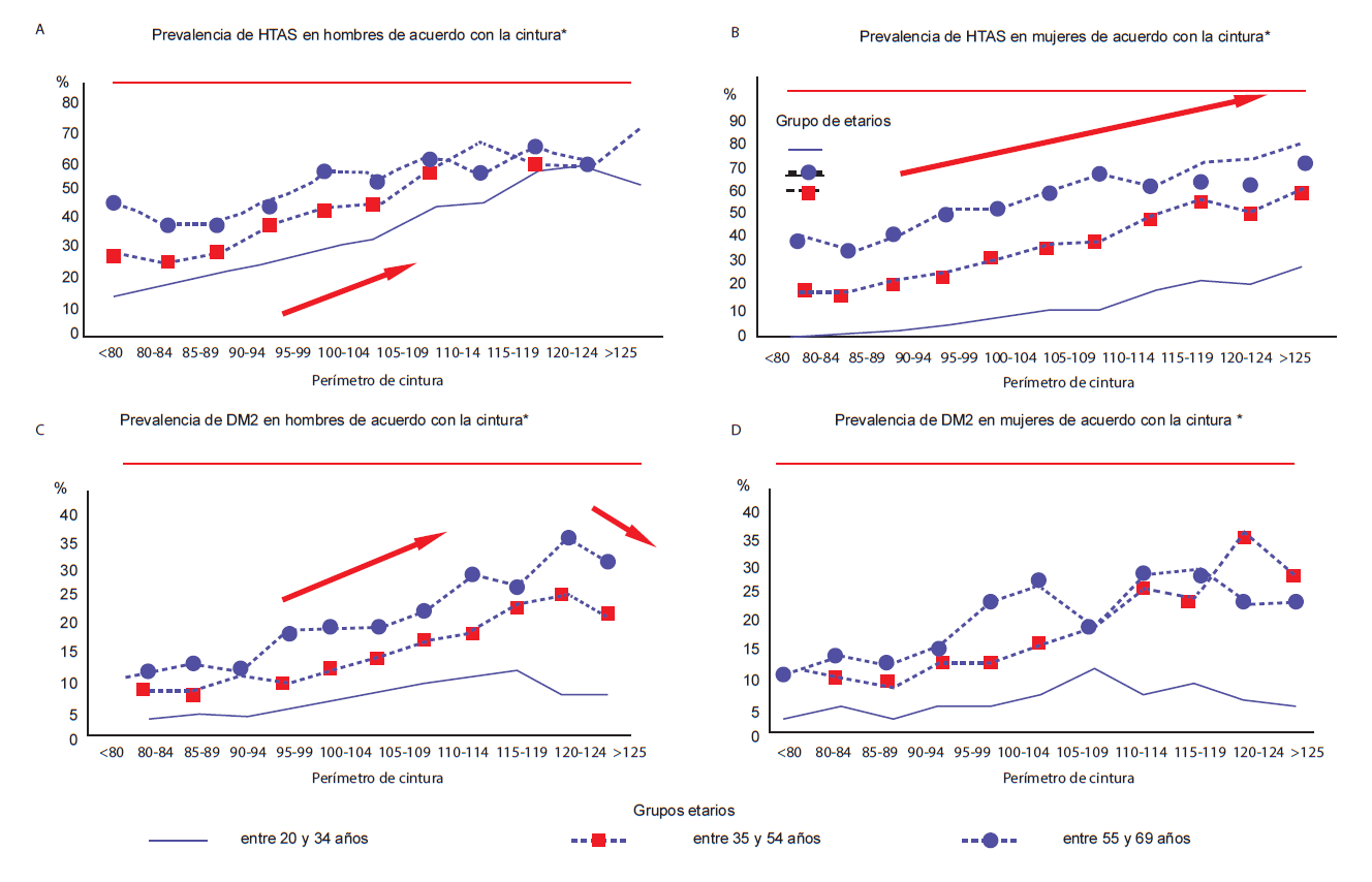 Un aspecto interesante es que al analizar diferentes puntos de corte de la cintura en hombres y mujeres mexicanos para conocer la prevalencia de hipertensión y diabetes, se establece un comportamiento muy interesante, pues si bien los puntos de corte son útiles para cuestiones de tipo epidemiológico, en la práctica clínica se deben considerar otros aspectos, como la presencia o no de comorbilidad asociada (diabetes, dislipidemias, ateroesclerosis, enfermedad renal, entre otras), ya que el impacto que puede tener la obesidad central suele ser diferente. Por lo tanto, nuestra recomendación es no tomar de manera dogmática los puntos de corte internacionalmente mencionados, además de que debe ser más útil utilizar rangos de riesgo. Así, cinturas por debajo de 80 en ambos sexos se asocian a baja prevalencia y cinturas de 85 en adelante incrementan la probabilidad de tener otras enfermedades crónicas no trasmisibles; si se superan los 90 cm en ambos sexos, la probabilidad crece de forma importante, sin embargo en la mujer joven el impacto es menor que en la postmenopáusica (figura 5 A, B, C, D). Otro aspecto notable es que cinturas muy grandes (> 140) no guardan relación proporcional con los niveles séricos de glucosa y muchos no tienen hipertensión; es probable que aspectos genéticos participen en este sentido, ya que para llegar a tener obesidad mórbida se requiere de una reserva pancreática notable.