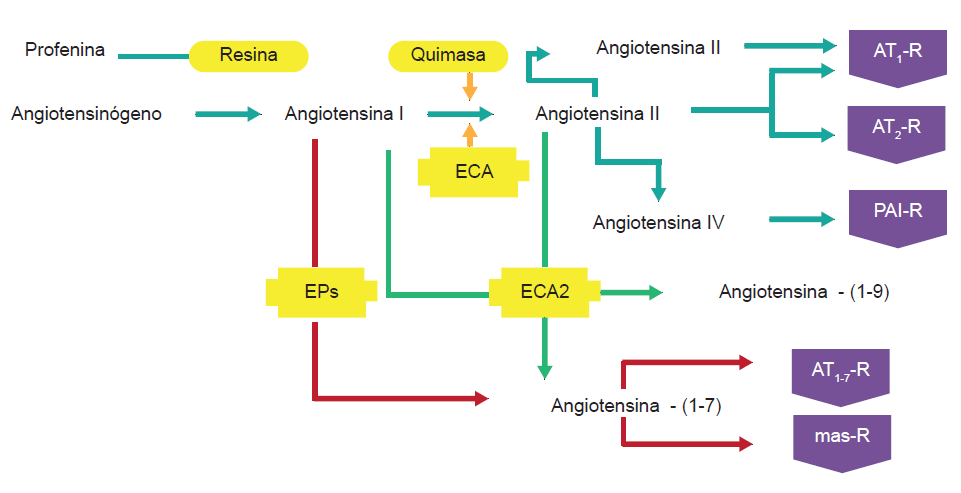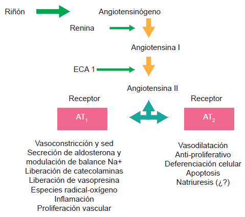 Clásicamente la angiotensina II (Ang II), el producto central del sistema renina-angiotensina (SRA) (figura 6), es bien conocida como la responsable de los efectos vasoconstrictivos, de influenciar a los túbulos renales para la retención de sodio y agua, así como de la liberación de aldosterona a partir de la glándula suprarrenal, además de que participa en la regulación del centro de la sed.