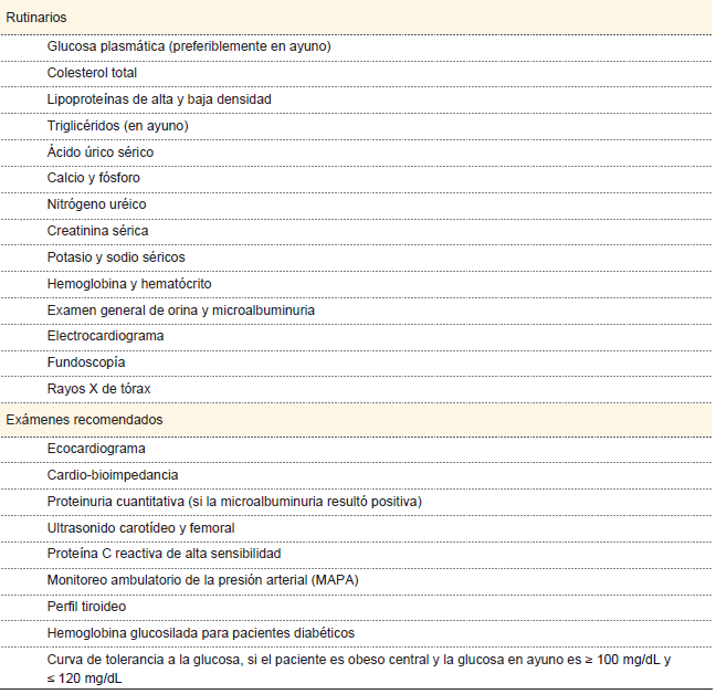 Los exámenes de laboratorio (cuadro VII) están dirigidos a encontrar evidencia de factores de riesgo adicional, HTAS secundaria a una posible causa conocida y determinar si hay lesión a órganos blanco. El mínimo de exámenes requeridos es materia de debate; sin embargo, existe el consenso de que deberá irse de lo más simple a lo más sofisticado. Mientras más joven sea la persona en estudio, más alta será la presión y más rápido su desarrollo; por lo tanto, más detallado deberá ser el trabajo diagnóstico.