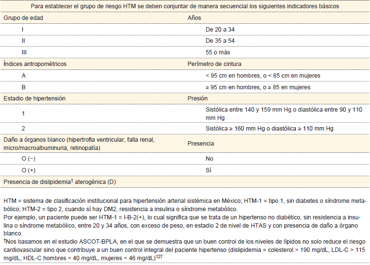 El sistema de clasificación HTM toma en cuenta cinco indicadores básicos que rápidamente permiten al clínico saber el contexto del enfermo hipertenso al cual se enfrenta, por lo que tendrá que diseñar un plan de trabajo y metas terapéuticas. Además, debido a los resultados contundentes del estudio AS-COTBPLA, 127 la asociación de una estatina para el control estricto de la dislipidemia aterogénica contribuye a un mejor control de la presión arterial, por lo que siempre debe tenerse en mente el manejo individual y global del paciente hipertenso. El buen control de factores comórbidos de riesgo cardiovascular frecuentemente ayuda a un mejor control del paciente hipertenso y viceversa.