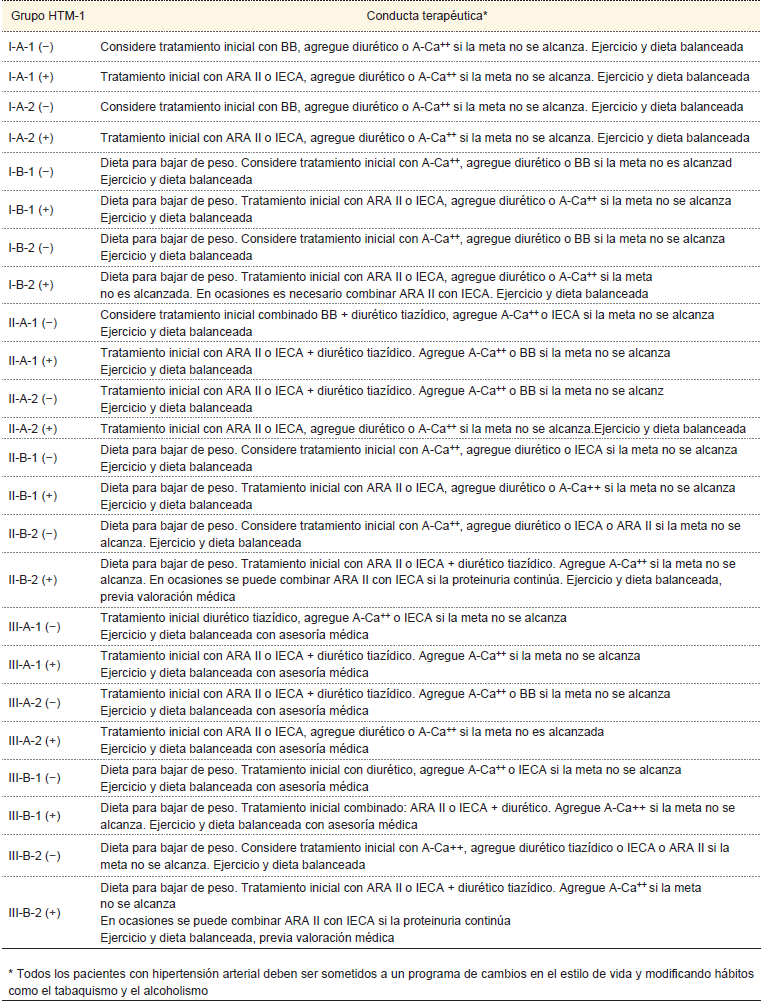 El sistema de clasificación HTM propuesto por nuestro grupo de trabajo nos permitió la construcción de las recomendaciones para el tratamiento farmacológico y no farmacológico. Dichas recomendaciones aparecen en el cuadro XII y las figuras 8, 9 y 10.