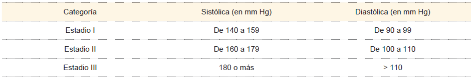 La clasificación por estadios se basa en las cifras de presión arterial sistémica en mm Hg registrados tanto en la diastólica como en la sistólica. Si una persona hipertensa de acuerdo con las cifras de presión detectadas cae en una categoría con la sistólica y en otra con la diastólica, se debe clasificar de acuerdo con el valor más alto de las dos. Los estadios se muestran en el cuadro II.