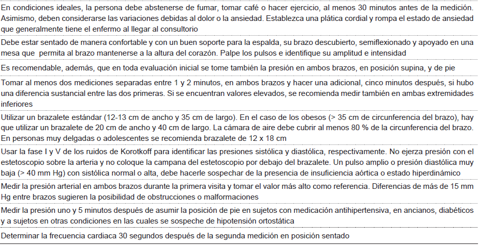 En lo posible, estandarice el ambiente cuando mida la presión arterial: provea de un ambiente relajado, templado, con el paciente sentado y su brazo apoyado cómodamente (tome en cuenta que los principios de la buena técnica para medir la presión arterial son claves. Si la primera medida excede 140/90 mm Hg, tome una segunda lectura confirmativa al final de la consulta).