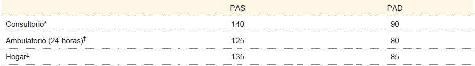PAS = presión arterial sistólica; PAD = presión arterial diastólica* Presión de 135/85 mm Hg en diabéticos o nefrópatas† Cerciorarse de que no hay elevaciones súbitas que al promediarse se oculten‡ En dos ocasiones diferentes y en reposo, sin haber tomado café o estimulantes*Resultados de la ENSA 2000
