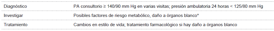 Los médicos deberán diagnosticar HTAS reactiva aislada (cuadro V), siempre y cuando registren presiones ≥ 140/90 mm Hg en varias visitas al médico, en tanto en el monitoreo ambulatorio durante 24 horas la presión sea ≤ 125/80 mm Hg. El tratamiento médico deberá ser instituido si hay evidencia de daño a órganos blanco o si se tiene un perfil de riesgo cardiovascular. Los cambios en el estilo de vida y un seguimiento cercano deberán ser llevados a cabo en personas con HTAS reactiva aislada, en quienes no se decidió iniciar tratamiento farmacológico.