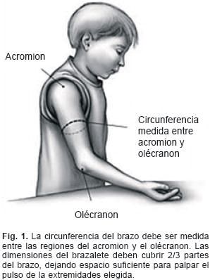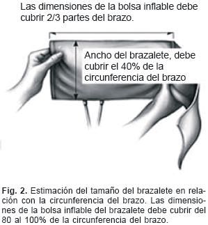 Se debe medir la presión arterial a todos los niños mayores de tres años que son evaluados clínicamente. 2 El método preferido es el auscultatorio, ya que los manómetros anaeroides son muy exactos cuando se calibran cada seis meses.5 Es muy relevante que el tamaño del brazalete sea el adecuado (figuras 1 y 2, cuadro III). Las mediciones obtenidas con aparatos oscilométricos que exceden el percentil 90 deben repetirse nuevamente por auscultación.6