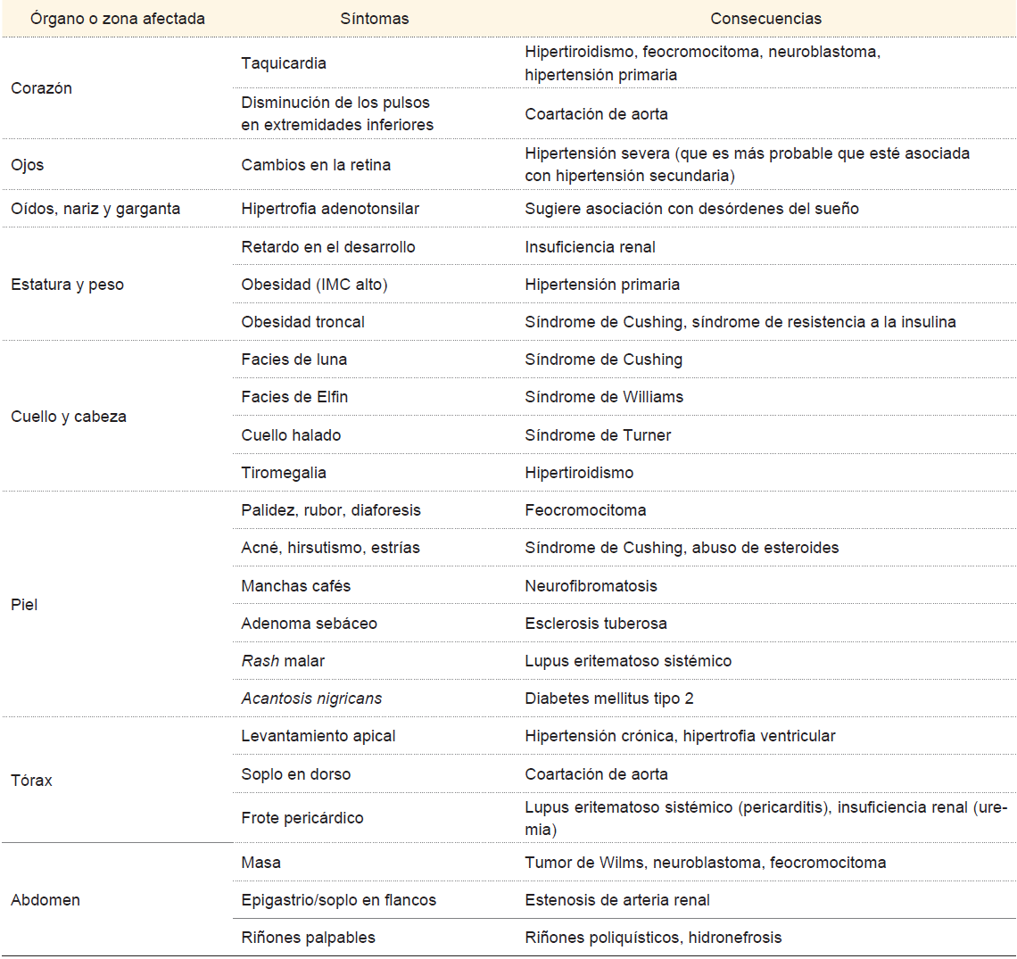 La hipertensión secundaria es más común en niños que en adultos. La historia clínica y el examen físico son los primeros pasos en la evaluación de cualquier niño con hipertensión arterial persistentemente elevada. Así, es importante buscar los signos y síntomas que sugieran enfermedad renal (hematuria, edema y fatiga), enfermedad cardiaca (dolor torácico, disnea al ejercicio y palpitaciones) y enfermedad de otros sistemas (endocrinológico, reumatológico). Hay que preguntarle a los familiares del paciente si hubo hospitalizaciones previas, trauma, infecciones del tracto urinario y desórdenes del sueño. Asimismo, hay que investigar si hay historia familiar de diabetes mellitus, obesidad, apnea del sueño y enfermedad renal, enfermedad cardiovascular (hiperlipidemias, accidente vascular cerebral) o endocrinopatías. Muchas drogas pueden alterar la presión arterial; es importante investigar el uso de drogas ilícitas. También es importante investigar el uso de suplementos alimentarios.