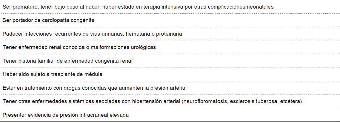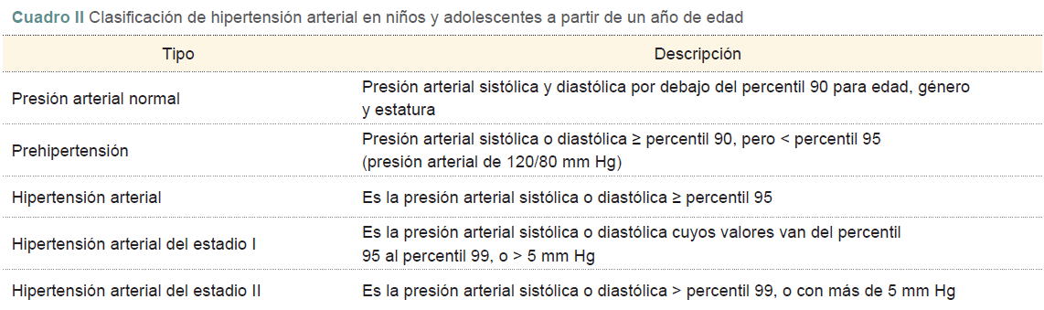 La hipertensión arterial se define como la presión sistólica o diastólica igual o mayor que el percentil 95 (medida en tres o más ocasiones en un lapso de 4 a 6 semanas) para edad, género y estatura (cuadro II).