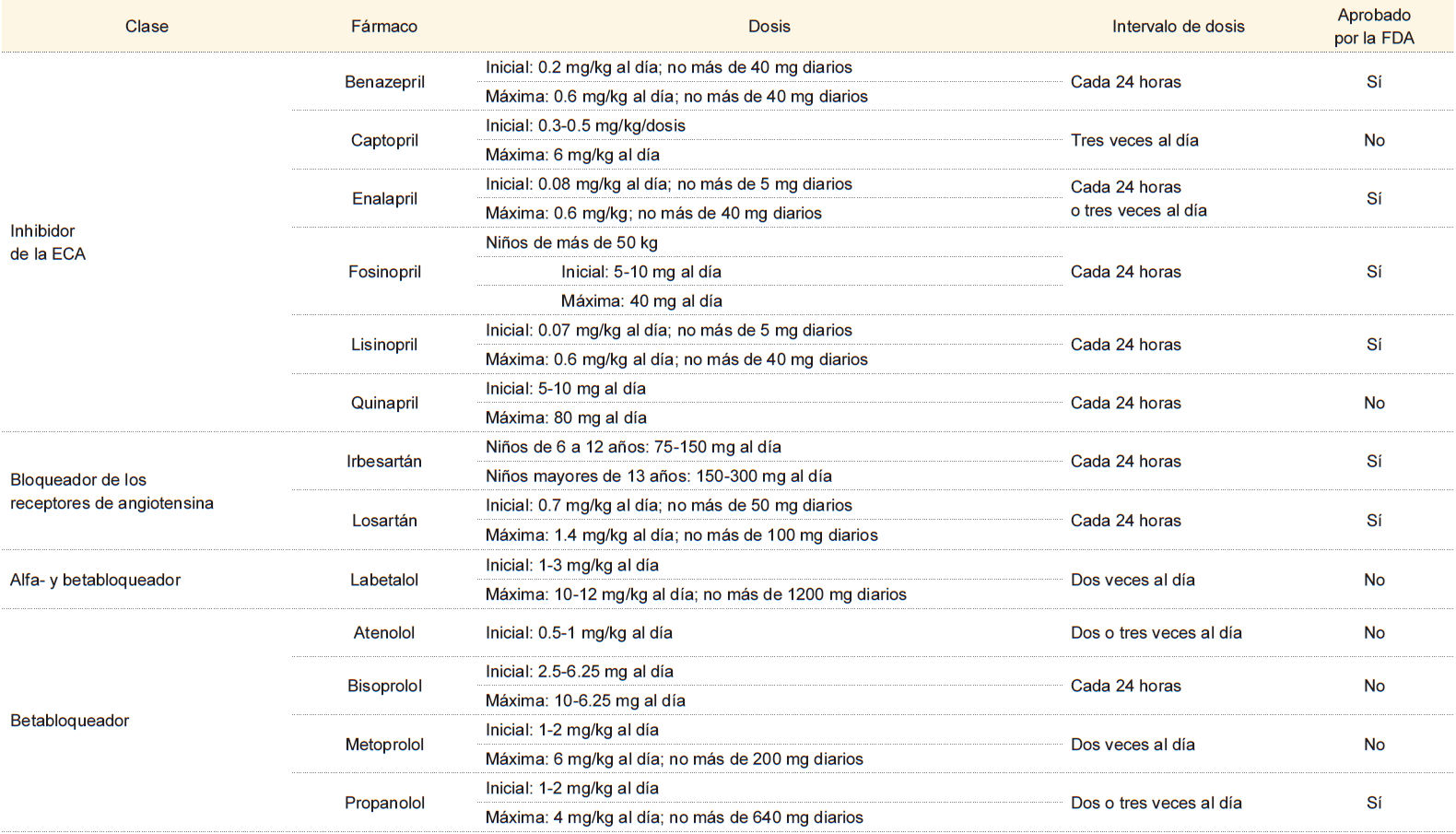 El tratamiento farmacológico1 está indicado en niños con hipertensión arterial secundaria o primaria que no tienen un control adecuado con las modificaciones en el estilo de vida.2 Los medicamentos de uso más común para el control de la presión en este grupo de edad son los inhibidores de la ECA, los bloqueadores de los receptores de angiotensina, los betabloqueadores, los bloqueadores de los canales de calcio y los diuréticos.3 La meta en el tratamiento antihipertensivo es que se logre una reducción de la presión arterial < el percentil 95.