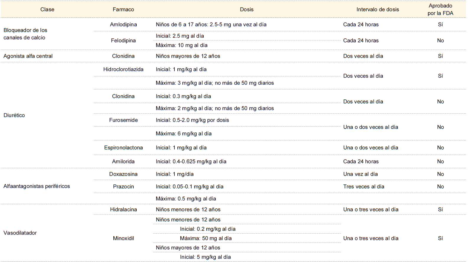 Actualmente existe una gran cantidad de medicamentos que se utilizan para el control de la presión arterial en los niños, pero se prefiere el uso de diuréticos y bloqueadores betaadrenérgicos como medicamentos de primera línea, aunque existen situaciones especiales ante las que se prefieren otros fármacos, por ejemplo, los inhibidores de la ECA o los bloqueadores de los receptores de angiotensina en niños con diabetes mellitus y microalbuminuria, así como el uso de bloqueadores betaadrenérgicos o bloqueadores de los canales de calcio en niños hipertensos con migraña. No se tiene experiencia en el uso de medicamentos combinados, excepto en bisoprolol/hidroclorotiazida, 36 por lo que su uso rutinario en niños no se recomienda (cuadro VIII 1, 2).