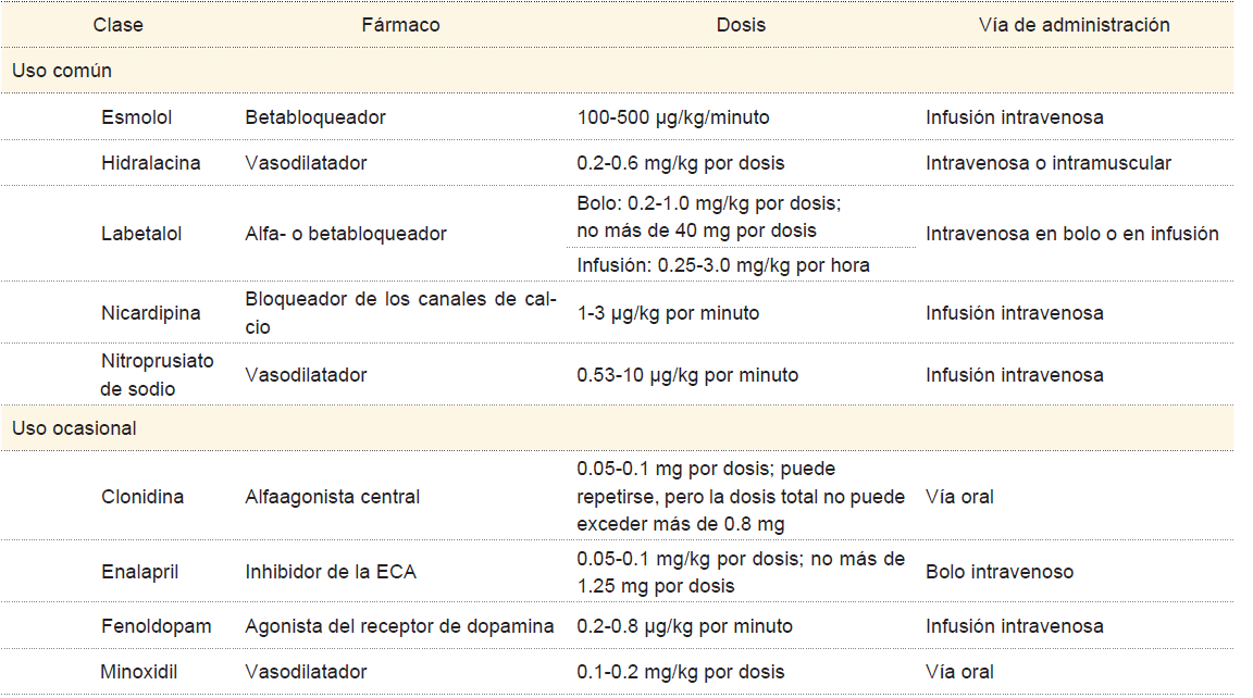 Se considera emergencia hipertensiva cuando la presión arterial se encuentra por arriba del percentil 99 y hay síntomas de daño a órgano blanco, como encefalopatía hipertensiva, la cual se manifiesta en el niño la mayoría de las veces por la presencia de crisis convulsivas. Se recomienda reducir la presión arterial en un 25 % en las primeras ocho horas para llevarla a valores normales en las siguientes 26 a 48 horas. En el cuadro IX están las dosis de los fármacos recomendados para su tratamiento.