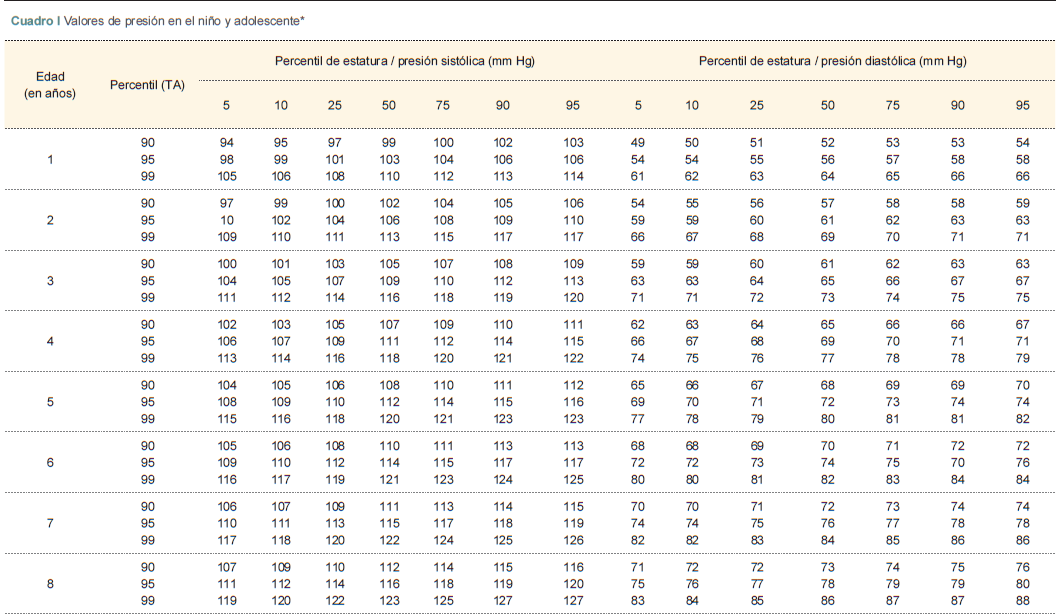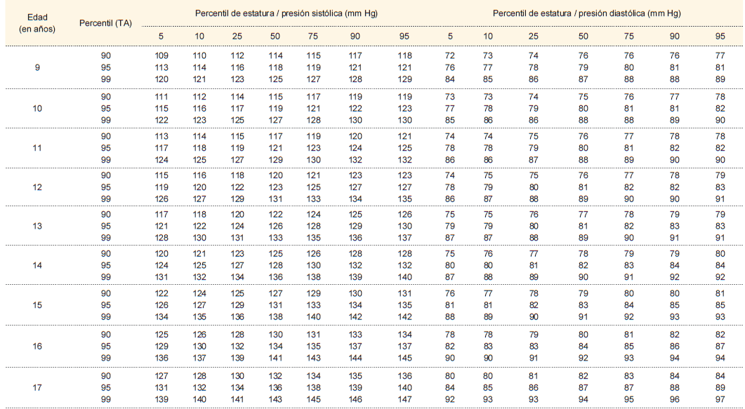 La presión arterial normal se define como la presión sistólica o diastólica < el percentil 90 para género, edad y estatura; cuando los rangos se encuentran entre el percentil 90 y 95 se considera presión arterial “normal alta” y el paciente tendrá mayor riesgo para desarrollar hipertensión.