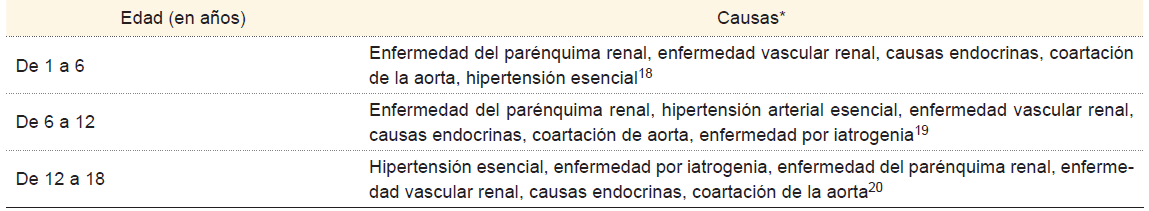 En un gran número de casos, la presencia de HTAS en la infancia es consecuencia de una serie de patologías subyacentes, cuya primera manifestación puede ser la elevación de la presión arterial. En general, cuanto más joven sea el niño y más altos sean los valores, mayor posibilidad hay de que la hipertensión arterial sea secundaria; las causas más frecuentes de esta podrían ser de origen renal, parenquimatoso o vascular (cuadro V).