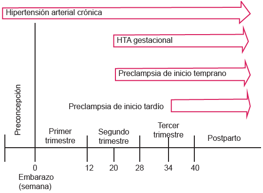 Hay cuatro categorías de trastornos hipertensivos en el embarazo, como se describe a continuación y en la figura 2. Utilizando la terminología recomendada por el grupo de trabajo NHBPEP,23 estas categorías se clasifican en: