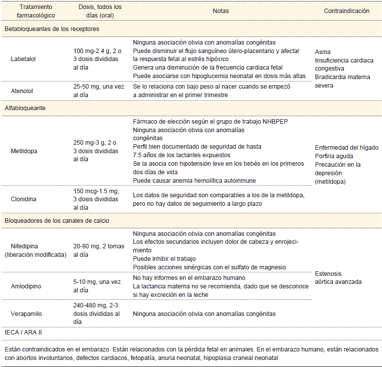Antes de la concepción, hay un desconocimiento generalizado de que una mayoría de los fármacos antihipertensivos que se utilizan comúnmente son teratogénicos y por lo tanto se continúan usando. Sin embargo, los inhibidores de la enzima convertidora de angiotensina (IECA) y los antagonistas del receptor de la angiotensina II (ARA II) deben evitarse, ya que están asociados con anomalías fetales, agenesia renal y particularmente con abortos en el primer trimestre.75,76,77 Hacia la semana 12 de embarazo, la disminución de la presión arterial en el embarazo normal por lo general significa que el tratamiento antihipertensivo puede suspenderse temporalmente hasta que la presión arterial se eleve de nuevo, por lo general en el tercer trimestre.