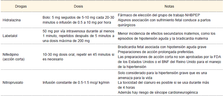 La hidralazina sigue siendo una opción popular de primera línea para el abordaje de las crisis hipertensivas en el embarazo, así como para el tratamiento de mantenimiento. Es un potente vasodilatador arteriolar y venodilatador, cuyo mecanismo no se conoce a pesar de que relaja el músculo liso vascular arteriolar, con lo que produce una reducción en la resistencia vascular periférica, así como vasodilatación. Para la concentración plasmática máxima bastan 30 minutos; además este vasodilatador ofrece efectos hipotensores con duración de hasta ocho horas. Con la administración parenteral, el inicio de la acción ocurre en un lapso de 10 a 20 minutos y puede durar hasta cuatro horas. La hidralazina cruza la placenta libremente y también aparece en pequeñas cantidades en la leche materna. La actividad de la renina plasmática se incrementa, lo que puede conducir a edema. La vasodilatación no es generalizada, con dilatación venosa mínima y, por lo tanto, hay menos incidencias frecuentes de hipotensión postural. Los pacientes a los que se les administra hidralazina por vía intravenosa a menudo experimentan disnea, dolor de cabeza, palpitaciones y alteraciones del sueño.