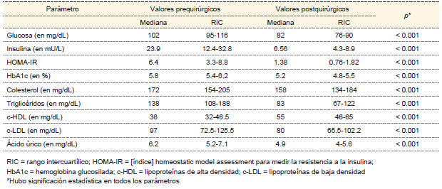 Métodos: estudio cuasi experimental con los datos antropométricos, clínicos y bioquímicos de una muestra de pacientes operados en la Clínica de Obesidad del Hospital de Especialidades del Centro Médico Nacional de marzo del 2011 a octubre del 2015.