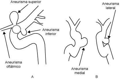 Esquema que demuestra los tipos de aneurismas paraclinoideos. En el esquema A una vista lateral de la arteria carótida interna, en la que se aprecia el origen superior (dorsal) de los aneurismas de la arteria oftálmica y el origen inferior (ventral) de los aneurismas paraclinoideos. En línea punteada el origen de aneurismas medial o lateral En el esquema B, una vista anteroposterior donde se esquematiza el origen de un aneurisma medial (de la hipofisiaria superior), y el origen de un aneurisma paraclinoideo lateral (subclinoideo).