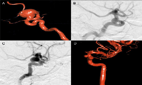 Para este tipo de aneurismas también está descrita la terapia endovascular; sin embargo, los aneurismas de esta localización también presentan algunos factores desfavorables para su embolización con coils, como su tamaño, el cuello ancho, los trombos intraaneurismáticos, la compresión del nervio óptico, entre otras. Además, el porcentaje de recanalización es muy alto, ya que va del 17 al 90 %. En la actualidad los stents diversores de flujo están siendo utilizados con la finalidad de redirigir el flujo de la arteria aferente y disminuir el paso de flujo sanguíneo dentro del aneurisma; sin embargo, no está indicado su uso en casos de aneurismas rotos y los resultados son preliminares.