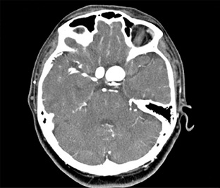 Se muestra una tomografía axial computarizada (TAC) contrastada, la cual identifica dos dilataciones saculares de una paciente con aneurismas paraclinoideos superiores bilaterales (en espejo). En este caso se operó inicialmente el aneurisma más grande