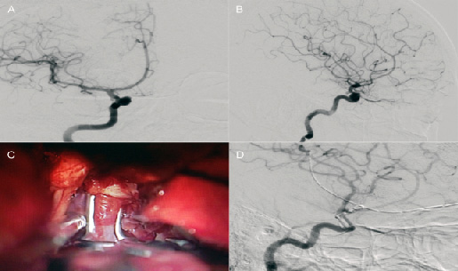 Caso clínico: una mujer de 43 años de edad, con un aneurisma incidental de arteria carótida interna derecha.En A se muestra la proyección anteroposterior en la que se observa un aneurisma paraclinoideo medial (de arteriahipofisiaria superior). En B se puede ver la proyección lateral. En C se nos presenta el momento de la colocación delclip fenestrado durante la cirugía. En D se presenta la angiografía postoperatoria en proyección lateral que demuestrala exclusión del aneurisma