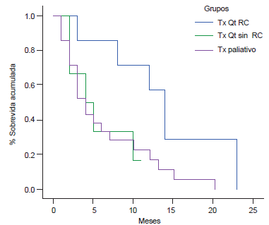 Resultados: del grupo de QTI siete pacientes alcanzaron remisión completa, comparados con uno del grupo de quimioterapia paliativa. La supervivencia global fue de 13.25 meses para los pacientes con QTI y de 3.35 meses para los pacientes de quimioterapia paliativa (p < 0.05).