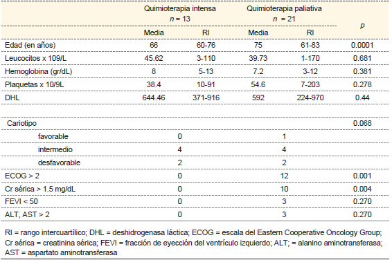 De los 40 pacientes, seis fallecieron dentro de los primeros seis días. De los 34 restantes 13 (38 %) recibieron tratamiento con QTI y 21 (62 %) con quimioterapia paliativa. La media de edad del grupo de QTI fue de 66 años, comparada con 75 años para el grupo de paliativa; no se observaron diferencias en los niveles de hemoglobina, la cuenta de plaquetas y la cuenta de leucocitos; en el grupo de QTI se incluyeron pacientes con mejor estado funcional y orgánico cuadro I. Del grupo de pacientes con QTI, 11 recibieron esquema 5:2 (citarabina más idarrubicina o daunorribicina) y dos pacientes esquema 7:3 (citarabina más idarrubicina); cuatro pacientes lograron RC, dos de ellos recibieron esquema 7:3. De los nueve que no lograron RC, seis pacientes recibieron un segundo ciclo de QTI (tres con citarabina más mitoxantrona y tres con citarabina más etopósido); de ellos, tres pacientes lograron RC. En total, siete de 13 pacientes (55 %) lograron RC; de ellos, tres tenían cariotipo normal y otro hiperdiploidía. Después de la quimioterapia de inducción a la remisión, cinco de los siete pacientes recibieron uno o dos ciclos de consolidación y seis continuaron con quimioterapia de mantenimiento.