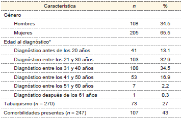 Se obtuvieron datos de 313 pacientes, aunque para algunas variables no se pudo disponer de información en todos los expedientes. La media de edad de los pacientes fue de 41 años (DE 11.22) y fueron 108 hombres (34.5 %) y 205 mujeres (65.5 %). La media de la edad al diagnóstico fue de 32 años (DE 9.72); el intervalo más frecuente fue el de 21 a 30 años (32.9 %) y el de 31 a 40 años (34.5 %). Se encontró que la edad mínima del diagnóstico de esclerosis múltiple fue a los 12 años y la edad máxima a los 66 años. Antes de los 20 años se hizo el diagnóstico a 41 pacientes (13.1 %) y después de los 40 años a 61 pacientes (20 %). Había presencia de tabaquismo positivo en 27 % de los pacientes (n = 270), así como alguna otra enfermedad en el 43 % (n = 247) (cuadro I).